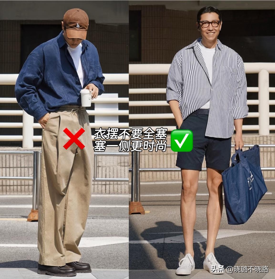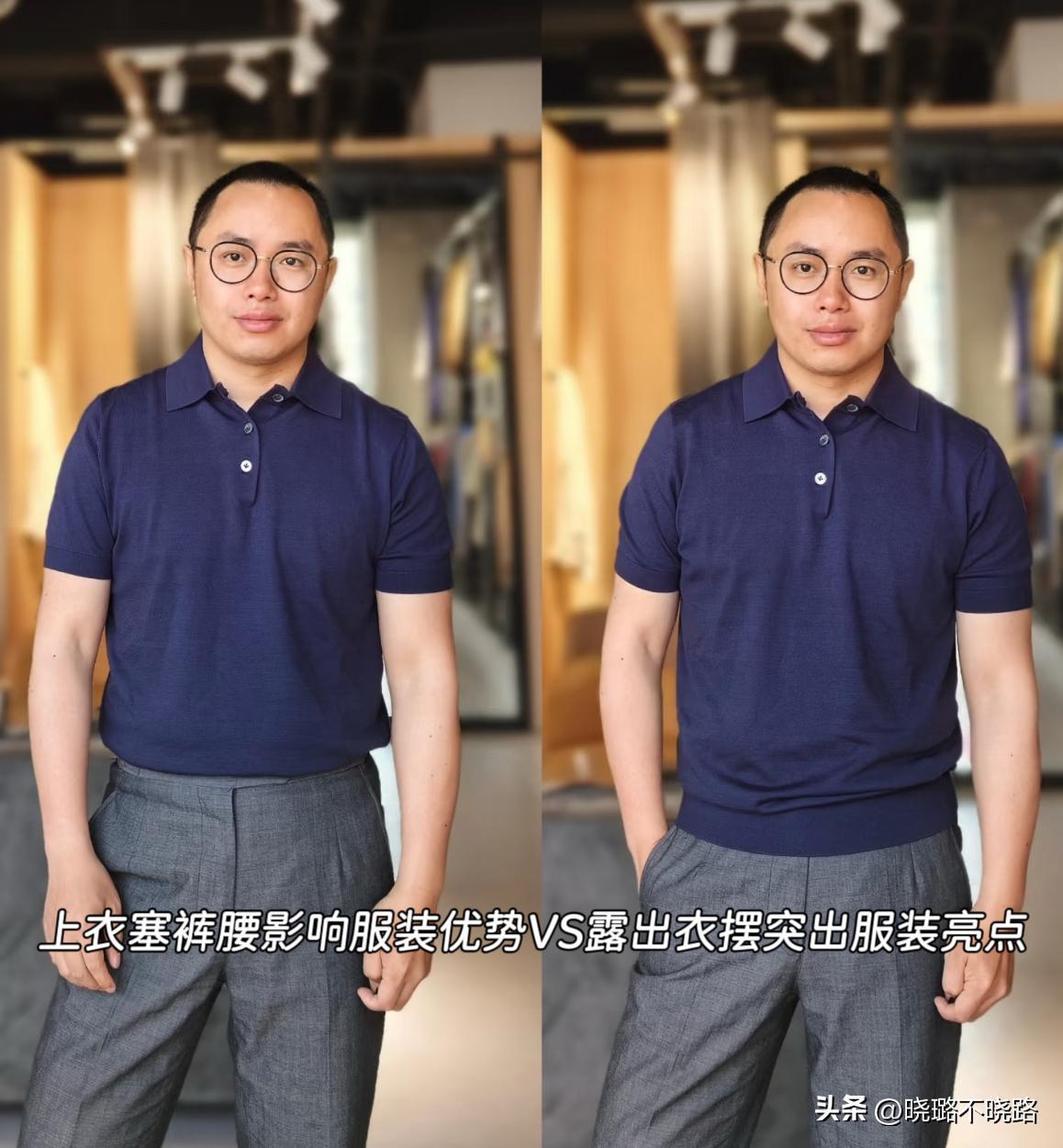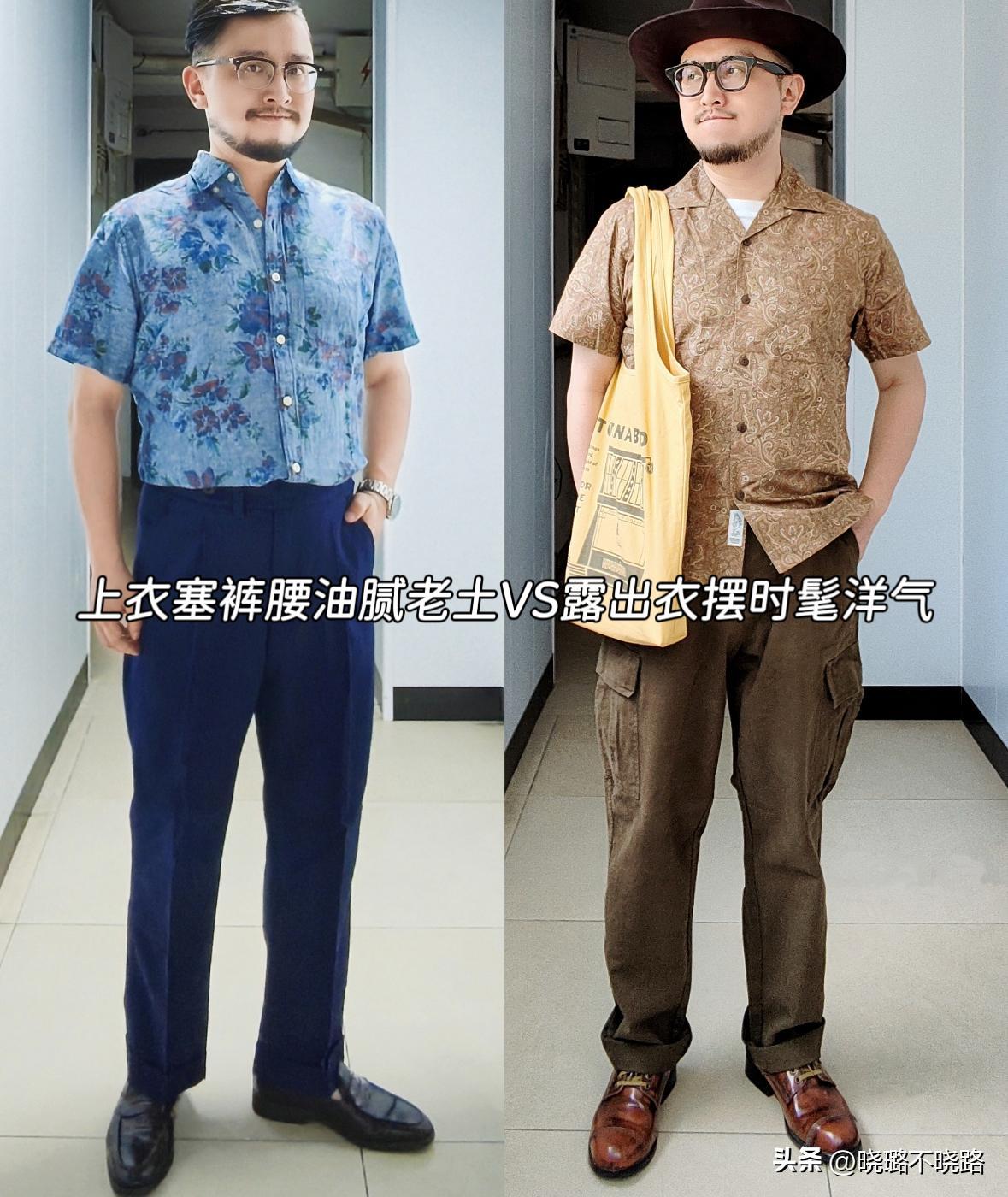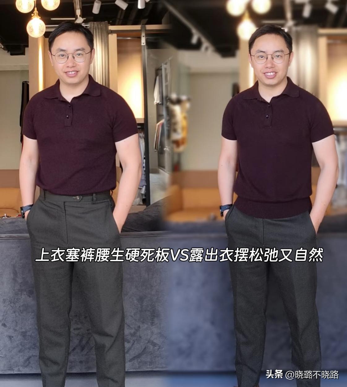 真是沒有對比就沒有傷害,中年男人穿衣服,扎褲腰和露衣襬的差距太大了,想要從“油膩大叔”逆襲成潮男,衣服就不要塞褲腰,否則油膩感撲面而來。