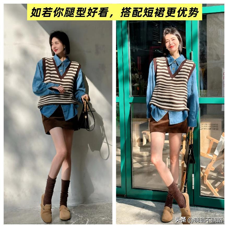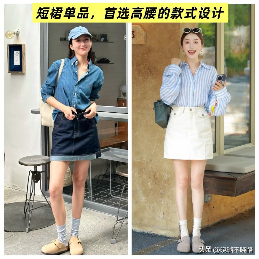 短裙這款單品就推薦各位女性可以首先考慮比較偏高腰的設計,在運用起來的時候,尤其是對於比例本身就沒有那麼好看,又或者是腿部比較短的女性來說,這樣的搭配其實可以非常明顯的增高我們的身材比例的水平位置,同時讓整個下半部分的腿型更加的顯纖長感一些。