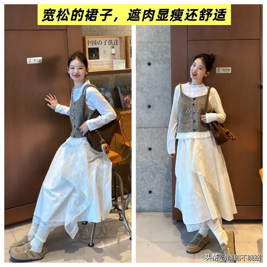 而在這個時候寬鬆的長裙進行運用的話,我們想要讓自上而下的身材狀態更加具有顯瘦效果,就比較適合結合搭配比較修身型的上衣,以此來形成上下系列的組合對比是最顯瘦,而且有着層次沒敢在的。