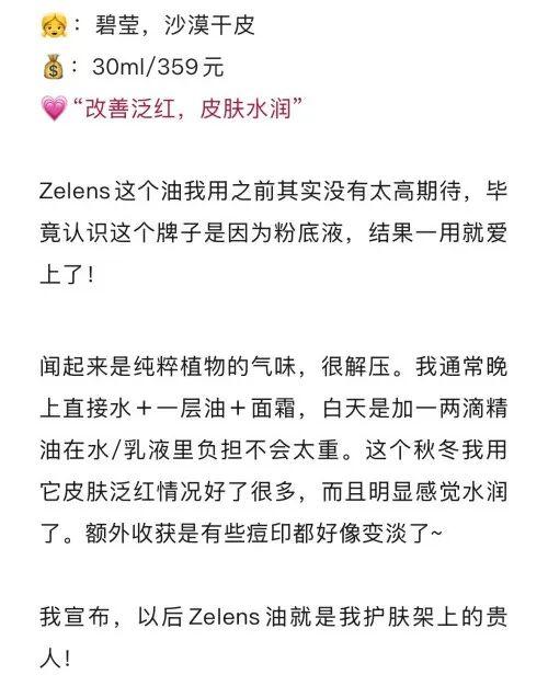 ZELENS這瓶植萃精華油是我們工作室好幾個幹皮、幹敏皮的愛,之前徵集愛用護膚品的時候,它就上榜過。▼