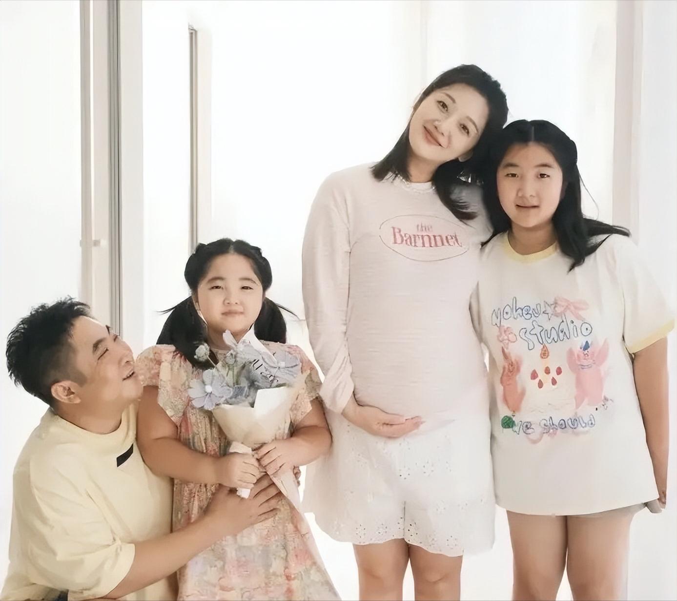 在莫丹懷着三胎的時候,一家人也拍了全家福。大姐依偎在媽媽身旁,爸爸抱着二姐,媽媽用手輕輕託着肚子。