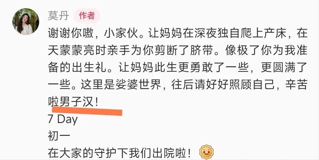38歲的莫丹激動發文,她說:謝謝你嗷,小傢伙。讓媽媽在深夜獨自爬山產牀,在天矇矇亮時親手爲你剪斷了臍帶。