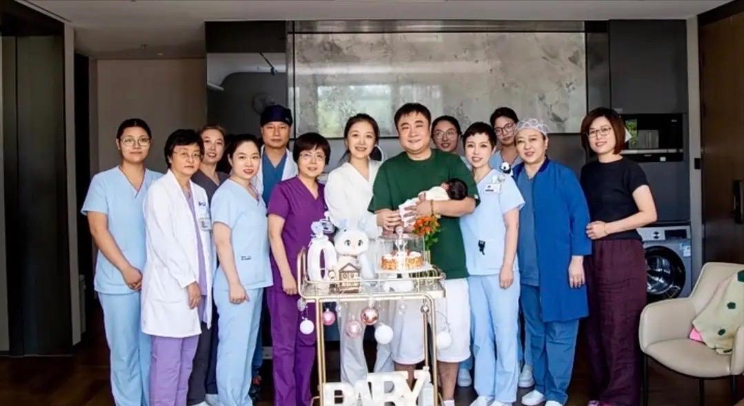莫丹還曬了和醫護人員的合影,她穿着白色月子服站在C位,左手邊是抱着小寶的老公喬杉。喬杉有一點中年發福,他對着鏡頭微笑、喜不自勝。