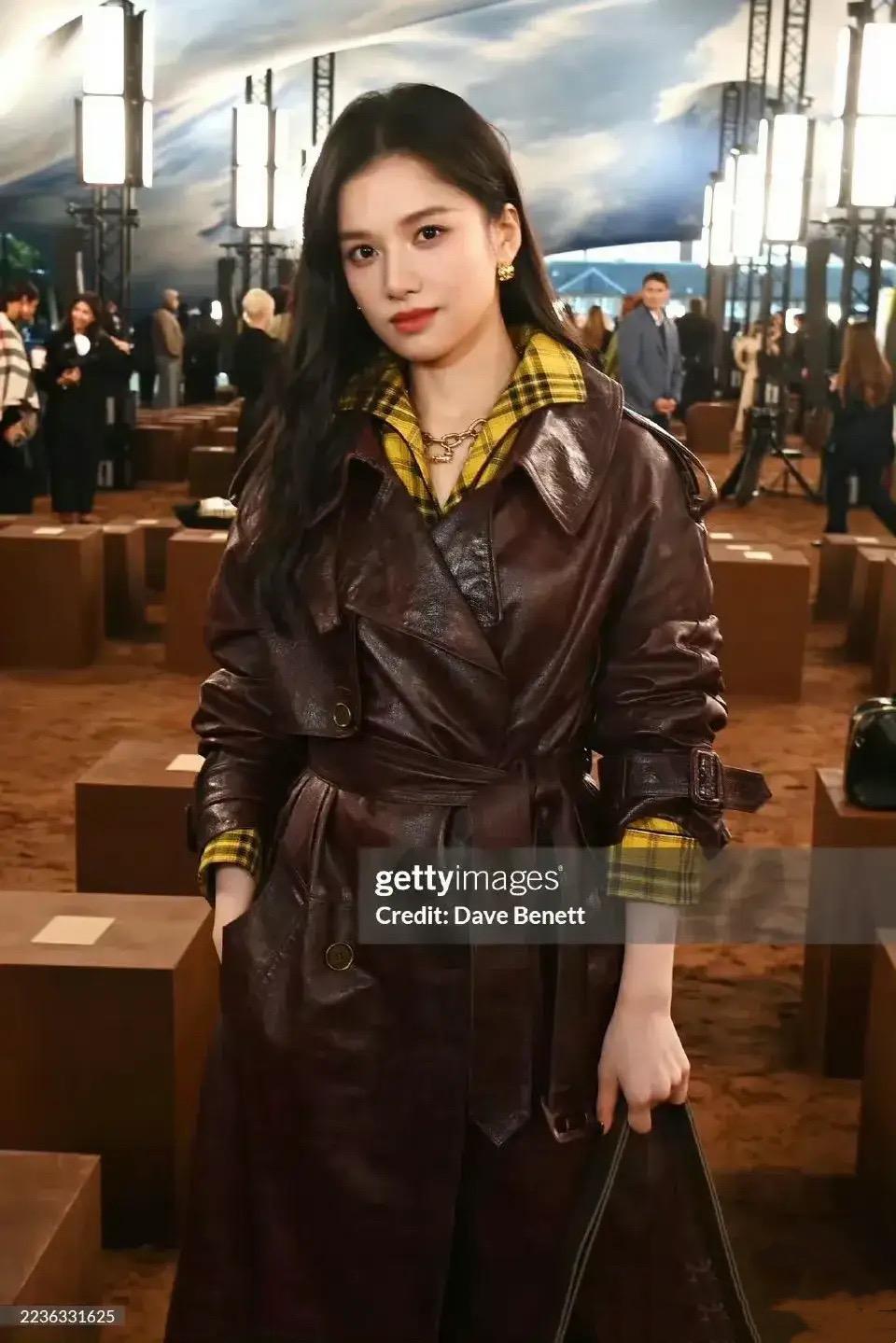 張婧儀雖然年紀小,但氣場很足。她身上有一種端莊大氣的美,衣着打扮也更酷颯一些。棗紅色的長款風衣,皮革質地的面料特別有辨識度,尤其是格子內襯、增添了層次感。