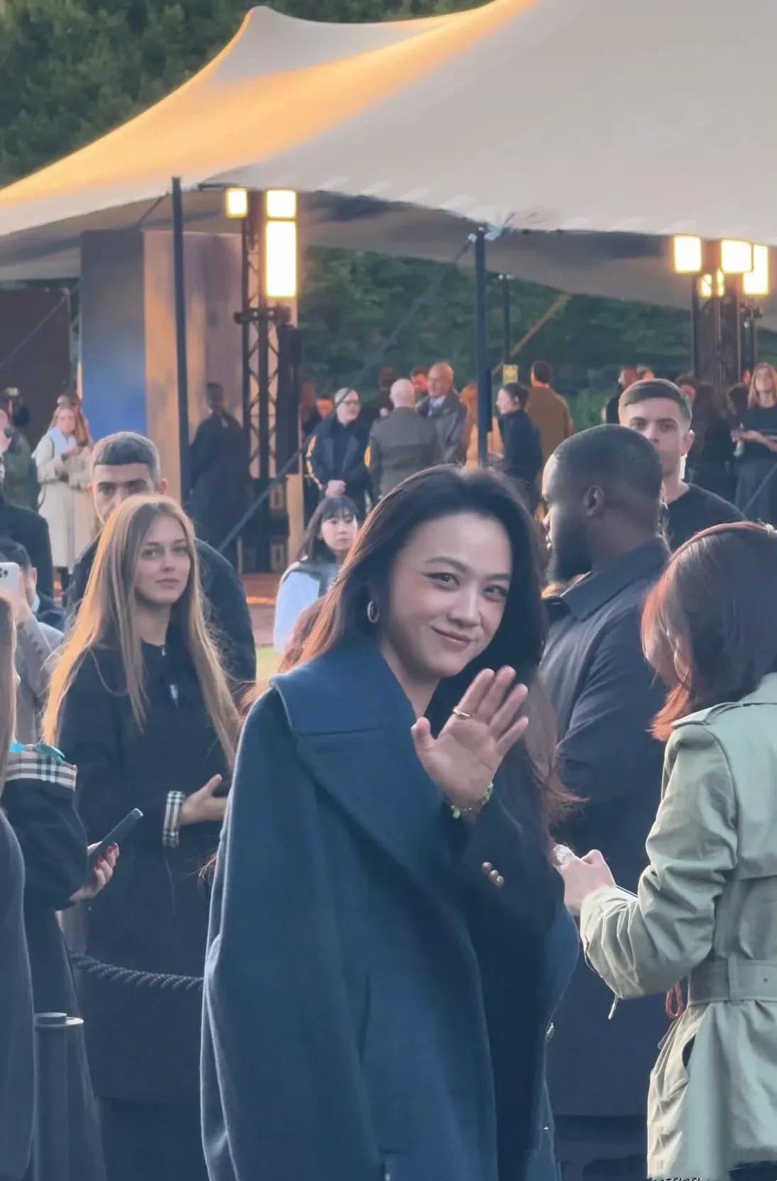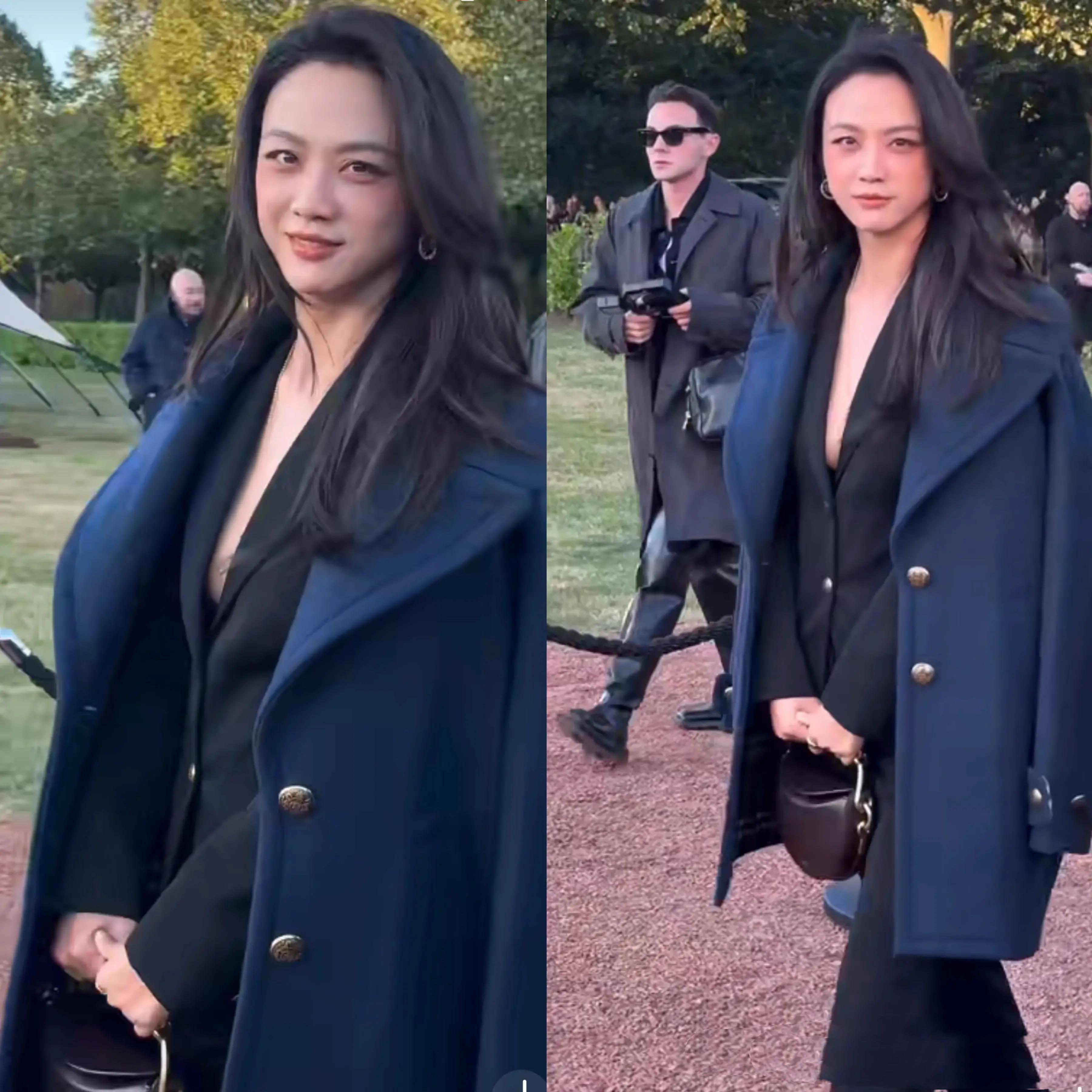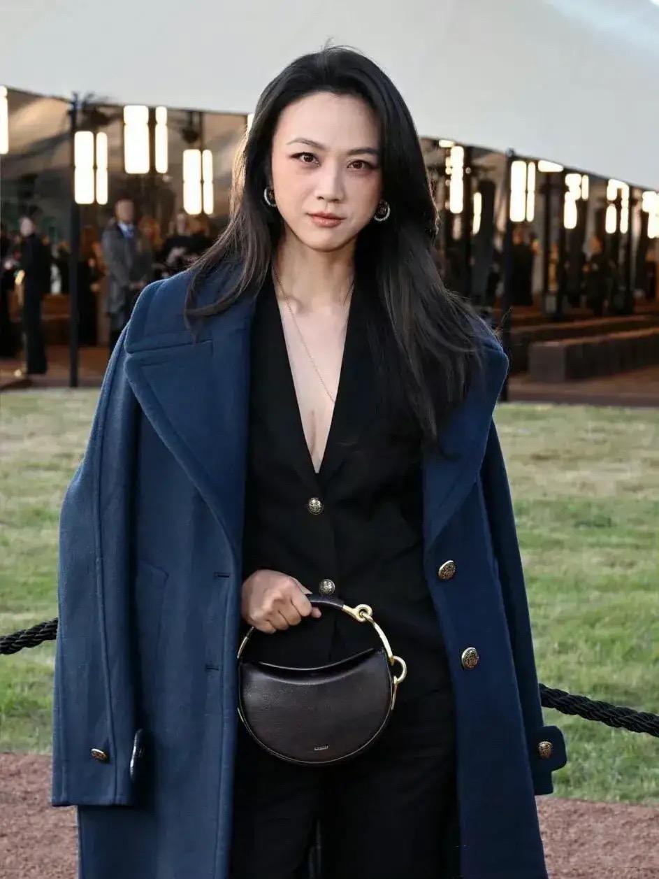 湯唯還是一如既往的鬆弛大方,這種時裝週活動早就遊刃有餘了。穿一件藏藍色雙排扣大衣,陪V領媳婦套裝,很拉風。