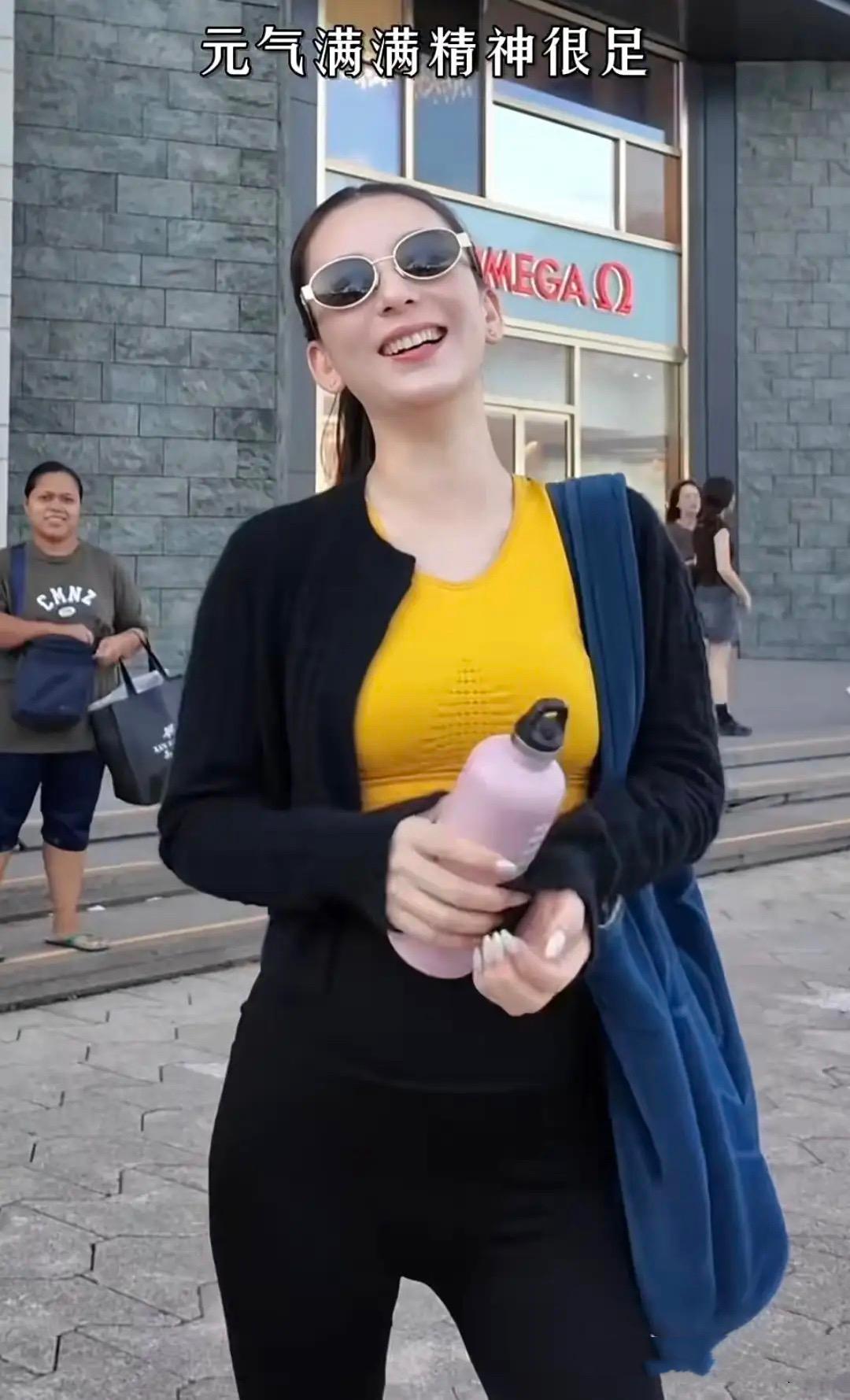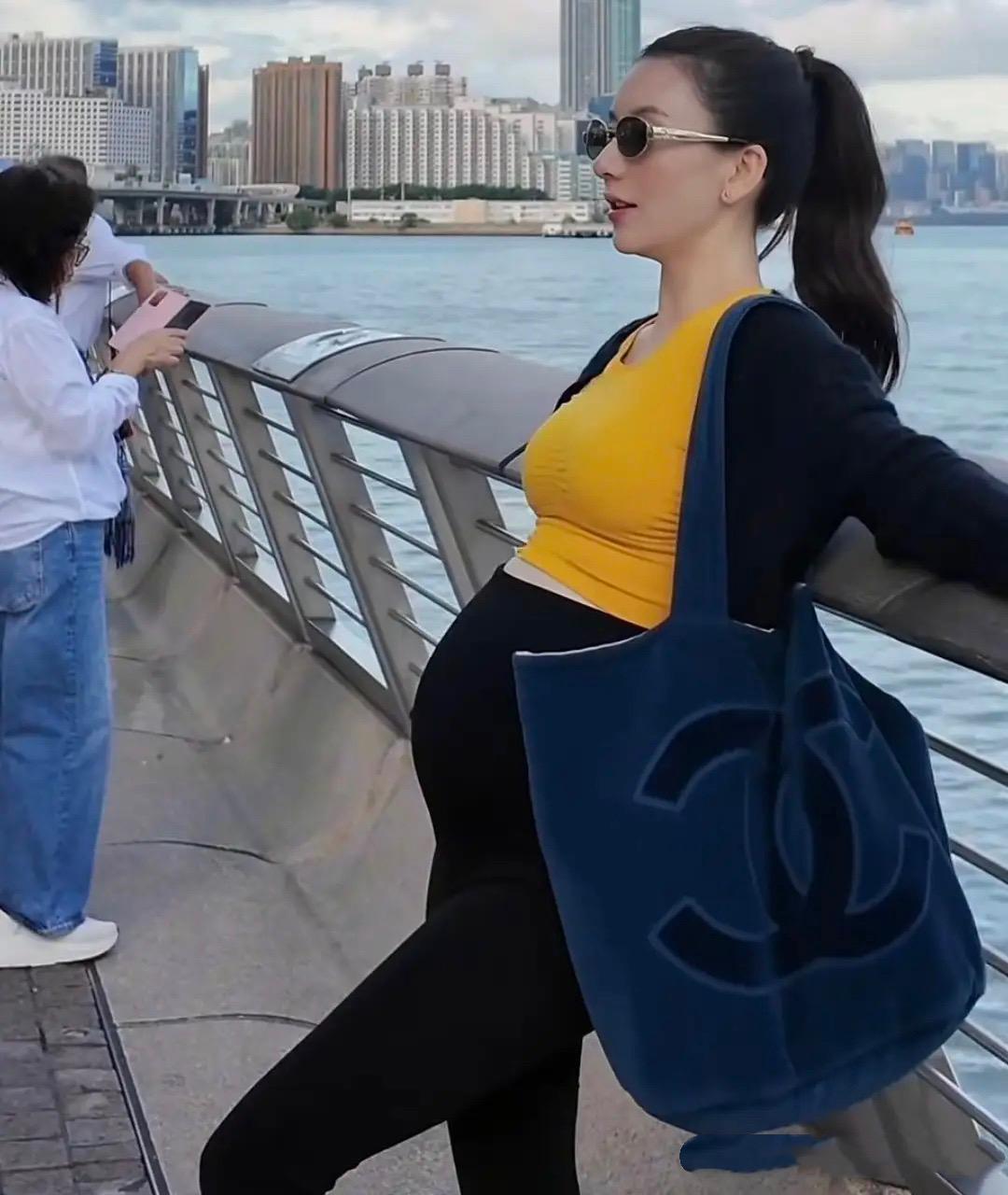 她穿着孕婦褲、修身的背心,還有收腰的開衫,是一副活力十足的模樣,精神狀態特別棒。高高紮起來的馬尾,顯得她更年輕了。