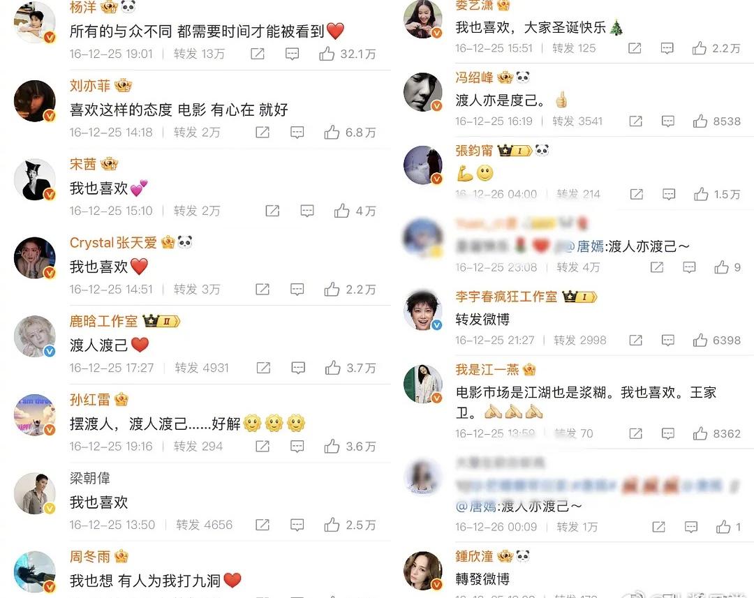 2016年12月,王家衛監製的電影《擺渡人》上映,但當時口碑崩塌,爲了拯救票房王家衛發文“我喜歡”!隨後梁朝偉、陳奕迅等大腕紛紛表態“我也喜歡”。