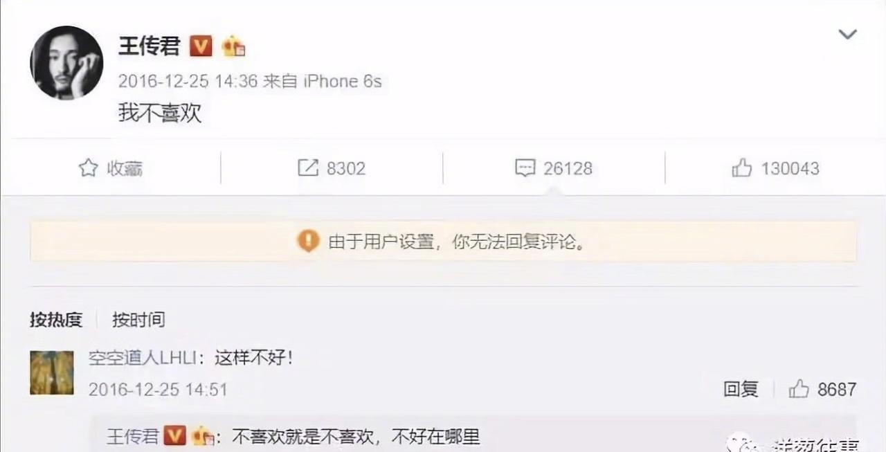 可這時候有一個另類的聲音傳出來,那就是王傳君回應了“我不喜歡”。當時不少網友質疑,不喜歡就不喜歡,幹嘛說出來,情商也太低了。
