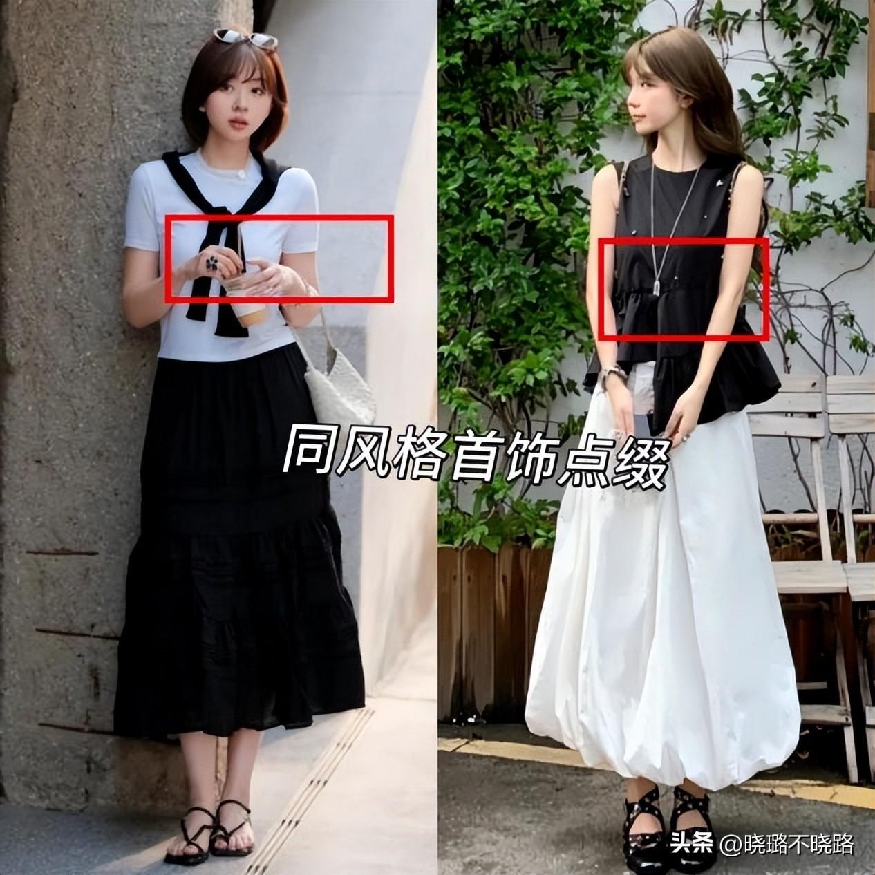 如果擔心整體的造型過於單調,沒有任何的吸睛度的時候,那麼大家可以用風格感強一些的配置進行提升。比如像這種偏精緻一些的緞面裙或者西裝裙,通過疊加珍珠項鍊金耳墜等增加裝飾感,全身的造型瞬間顯眼起來,反之,如果整體的搭配更加法式休閒一些,那麼和棒球帽休閒包包更配!