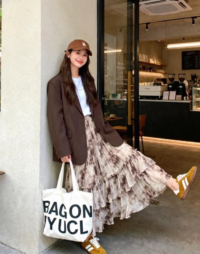 今年秋天,西裝外套可是很流行的呢,特別像這種棕色的款式,寬鬆的版型,很簡約大氣,內搭基礎款白色t恤,很好平衡了西裝帶來的正式感,下裝選擇一條扎染的荷葉邊長裙,層層疊疊的設計,隨着步伐的邁動輕盈飄逸,與西裝外套形成了碰撞,卻很和諧。鞋子穿的是棕黃色帶白的休閒鞋,活力與舒適感滿滿。