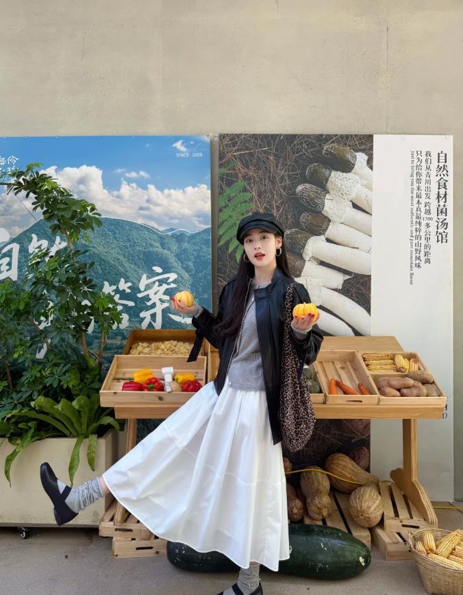 今年秋天,混搭風依舊是很流行的,這一套時髦又不失隨性,黑色的皮衣短外套,內搭淺灰色上衣,皮革外套自帶酷帥感,爲整個穿搭增添了個性與利落,下身配一條白色大裙襬半身長裙,黑色與白色的組合,就是很耐看,腳上穿灰色襪子,加上黑色的鞋子,色彩與整體搭配進行了呼應,豹紋包包的加入,爲整個穿搭增添了野性與時尚。
