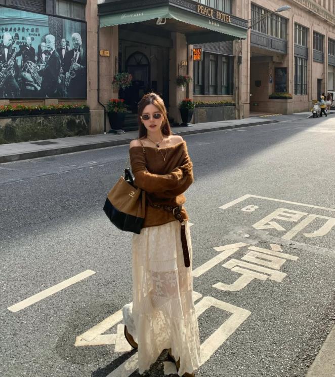 滿是法式浪漫與都市感的穿搭,上身是一件棕色一字肩針織衫,露肩的設計,巧妙露出優雅的肩頸線條,帶着幾分小性感與溫柔。下身搭配的米白色蕾絲長裙,輕盈飄逸,仙氣感直接拉滿了,利用一條棕色寬腰帶進行修飾,強調了腰線,還修飾了身材比例。