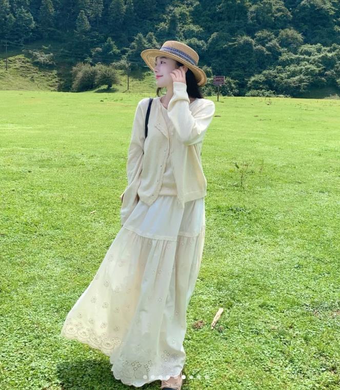 秋天的穿搭,應該是溫柔的,淺米色的針織開衫,柔和的色調與軟糯的材質,穿起來整個人都變得溫柔起來。內搭與針織開衫一樣的上衣,整體的配色很和諧,下身搭配一條帶着精緻花紋的白色蕾絲長裙,蕾絲元素增添了浪漫,頭上佩戴一頂草帽點綴,與田園背景相互映襯,度假風十足。