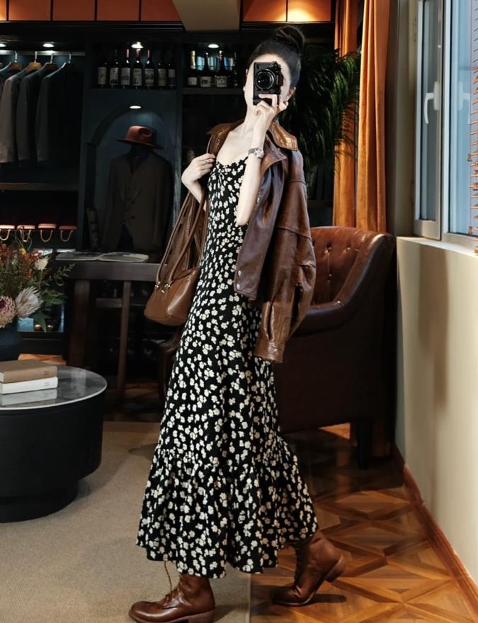 充滿了復古氣息還帶着幾分隨性與酷帥感,這就是皮衣外套和碎花長裙碰撞而來的,黑底白花的吊帶長裙,修飾版型又貼合身形,層疊的裙襬增添了幾分飄逸感,盡顯女性柔美,外面搭配一件棕色皮衣外套,爲整個穿搭注入了幾分酷帥感,再搭配一雙棕色復古短靴,與外套顏色進行了呼應,無論是休閒場合,還是稍微正式些的環境,都很時尚。