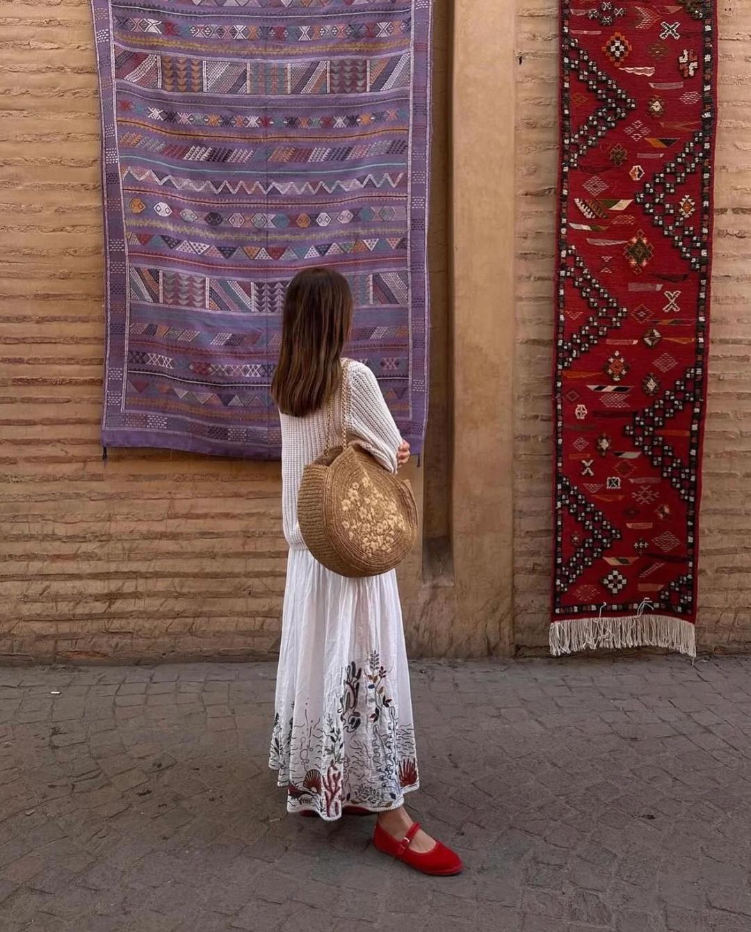 比如,搭印花裙,它倆可以說是絕配,連衣裙或者半裙都可以配它。有法式的浪漫風情,也很適合度假穿,非常出片。剛好十一馬上要到了,可以參考這個思路。▼