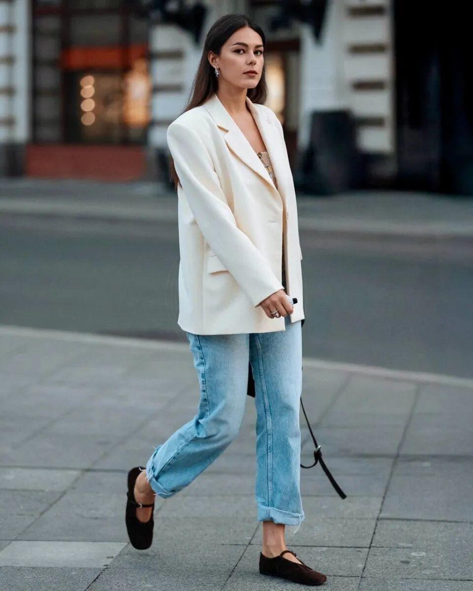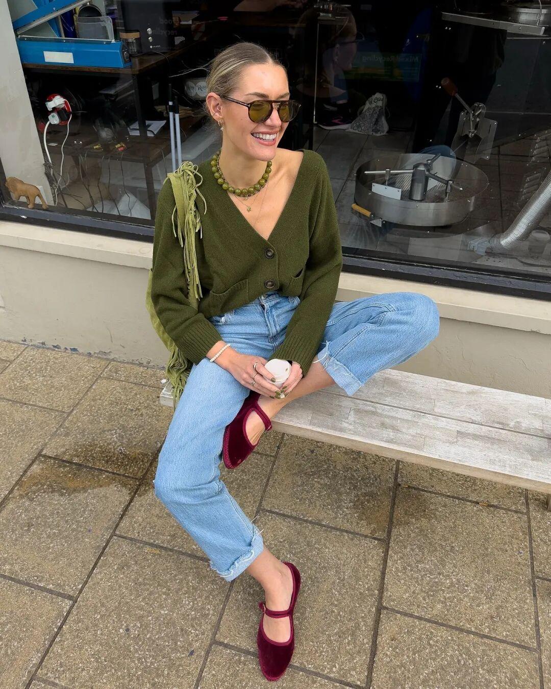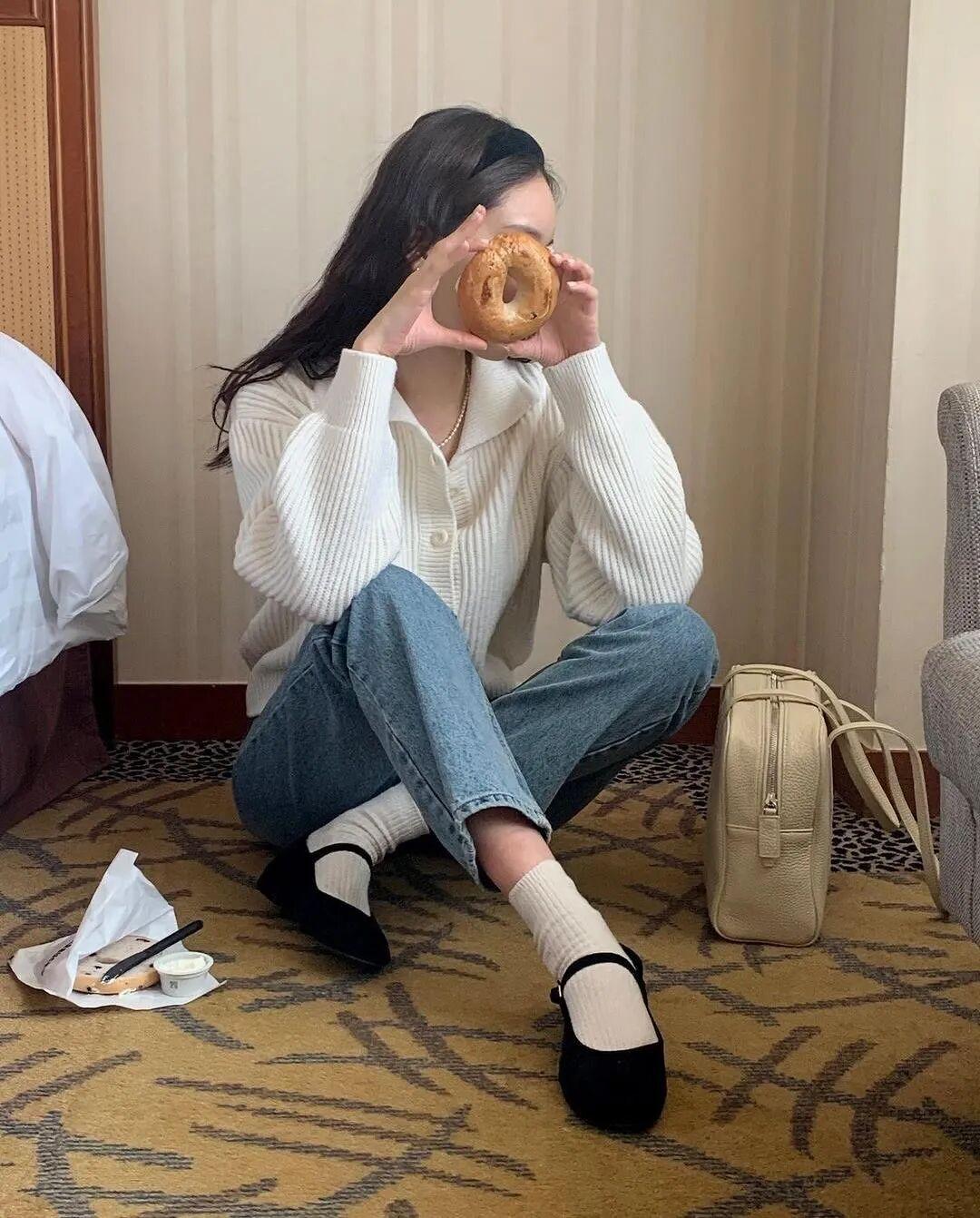 白毛衣+牛仔褲+絲絨瑪麗珍鞋的組合,可以直接複製上身,是非常日常的打開方式。