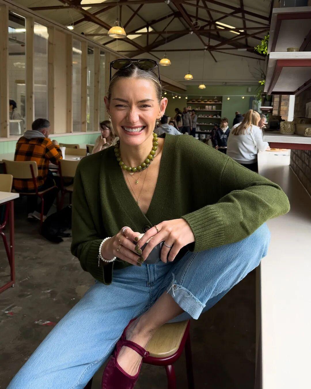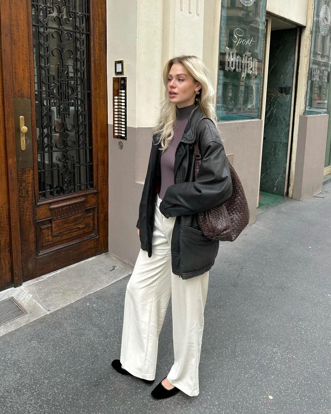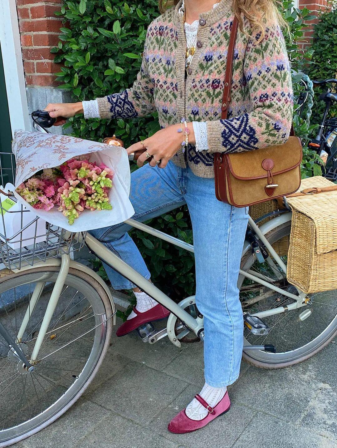 白毛衣+牛仔褲+絲絨瑪麗珍鞋的組合,可以直接複製上身,是非常日常的打開方式。