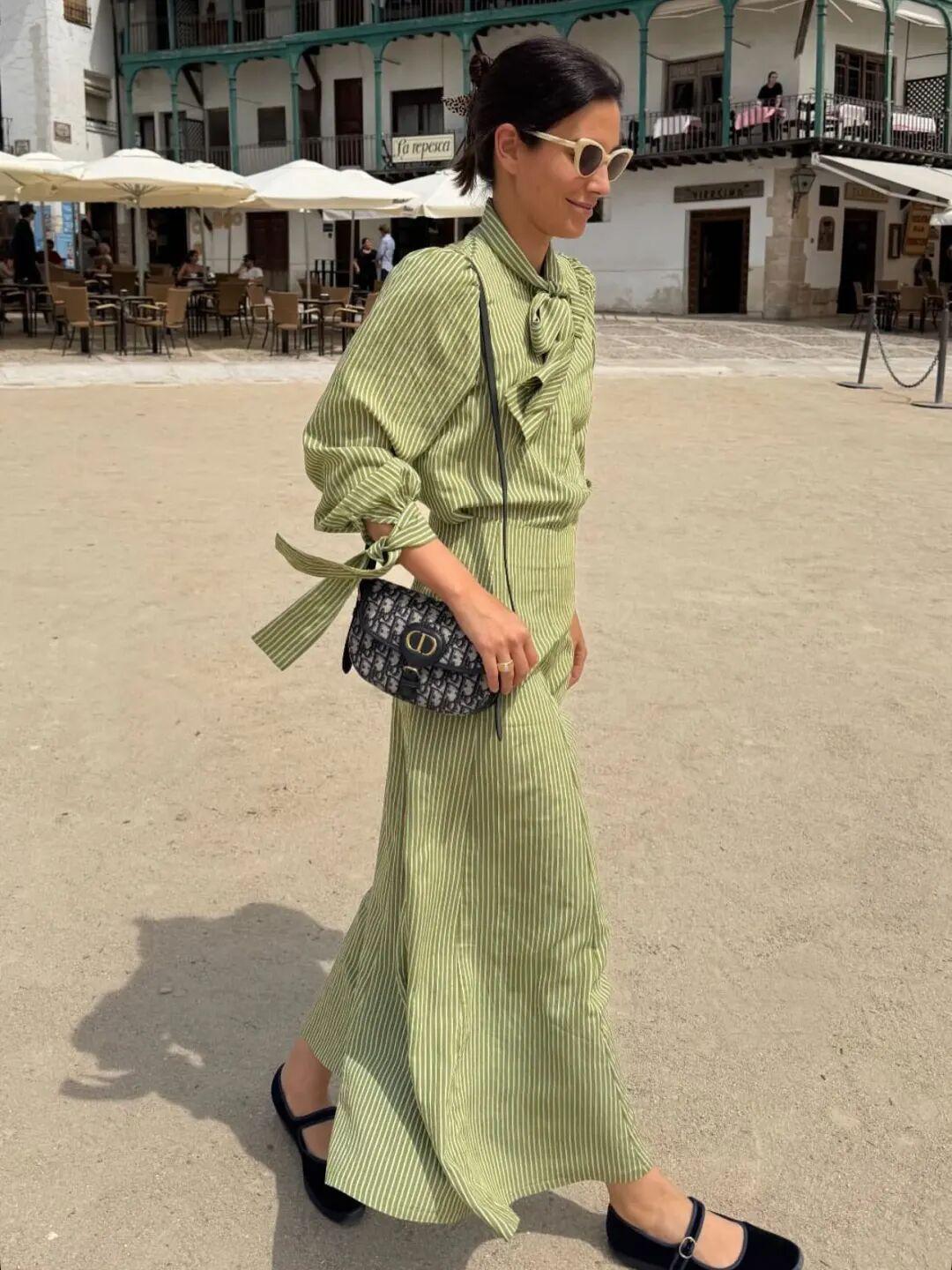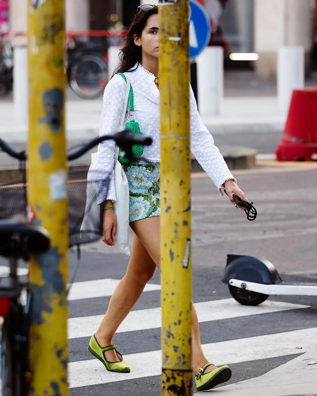 白褲子配小綠鞋好好看,上半身的綠色條紋襯衫和鞋子也有呼應。 ▼