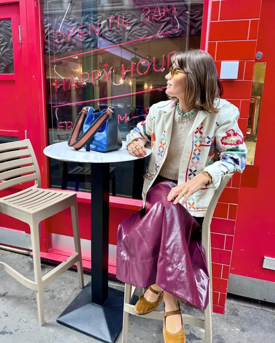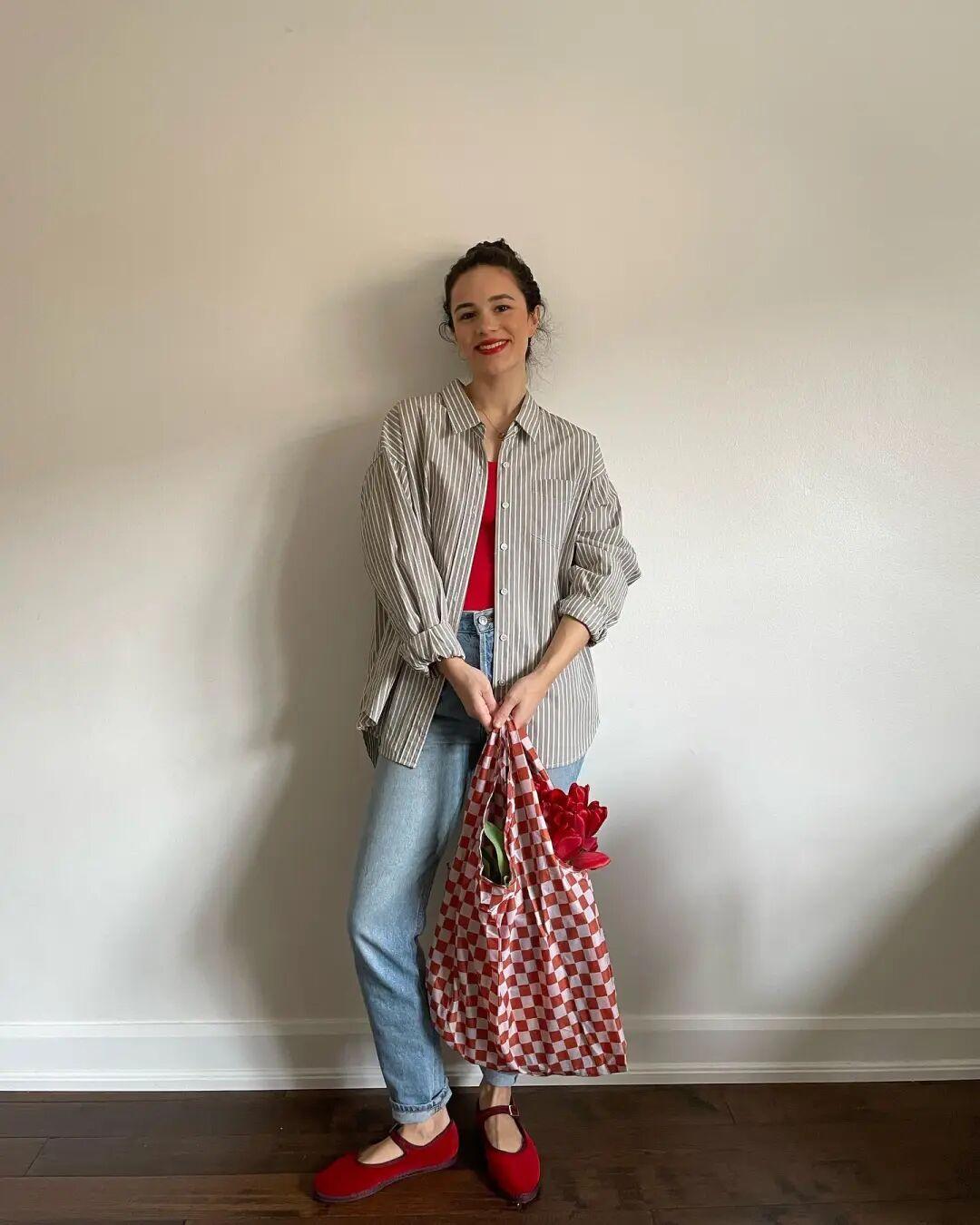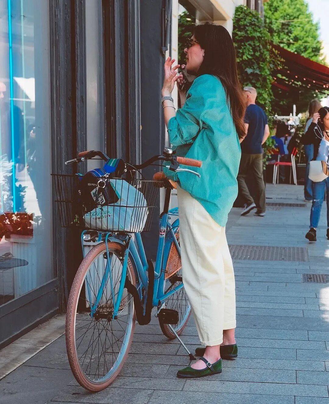比如藍色牛仔褲,配上絲絨瑪麗珍鞋,更有法式復古感。▼