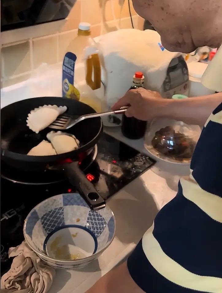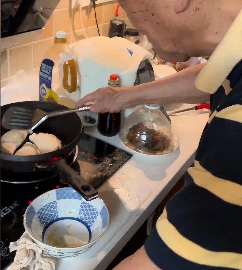 看牛犇老師做煎餃的模樣,動作有些顫巍巍的,他年紀太大了,滿臉的老年斑,有些力不從心的模樣。