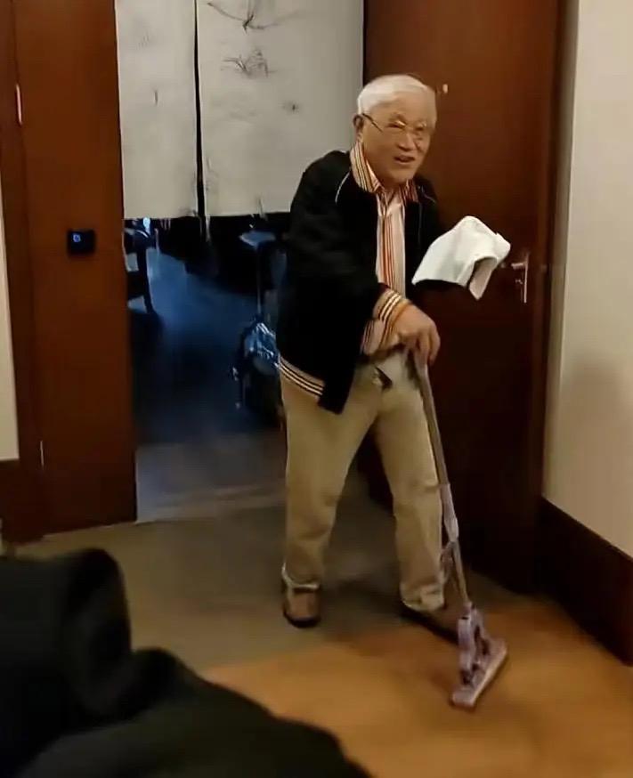 牛犇老師的腿腳也不那麼利落了,他走路的時候需要依靠助力了。可能一時間沒有找到柺杖,他直接拿着拖把當柺杖,也是挺不拘小節的。