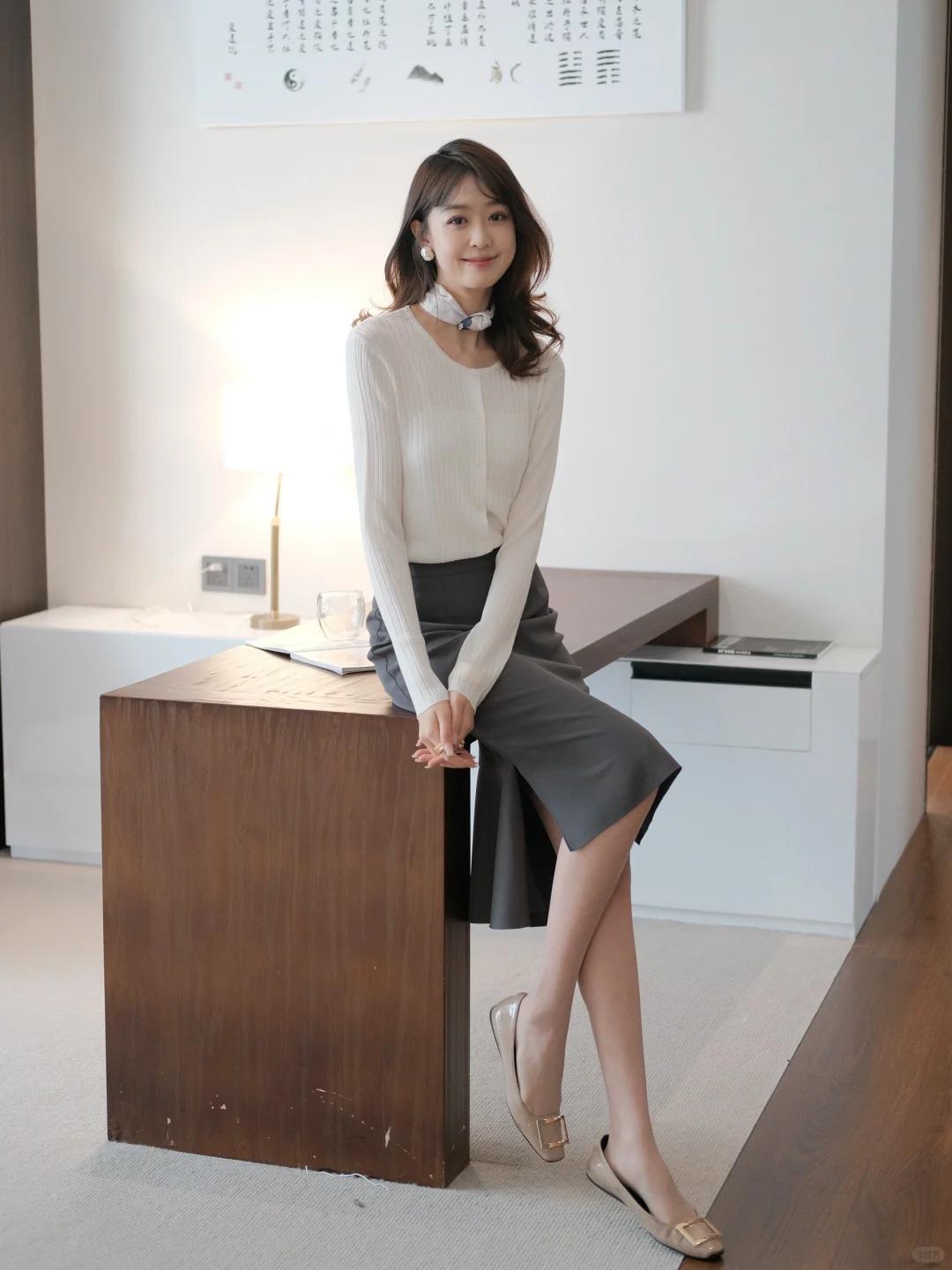 6:襯衫+半裙的組合最適合春秋季穿搭,腳下穿一雙淺口低跟皮鞋,顏色選銀色,和整體搭配相得益彰,不累腳還能提升氣質。再配上一條長筒襪,低調又大方,讓整個人看起來溫婉知性,站在講臺上親和力滿滿。