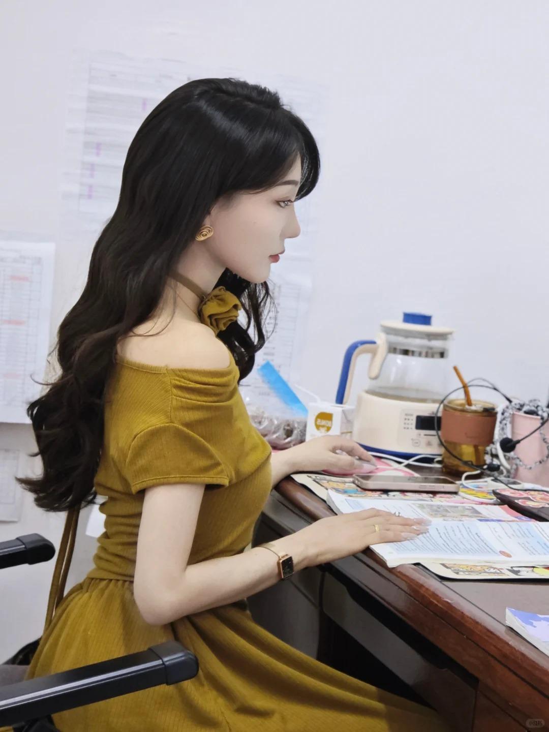 10:連衣裙也是女教師的好選擇。我有一條薑黃色的絲絨連衣裙,脖子上花朵裝飾,清新又優雅。領口是方領設計,微微露出鎖骨,展現出女性的柔美和氣質。