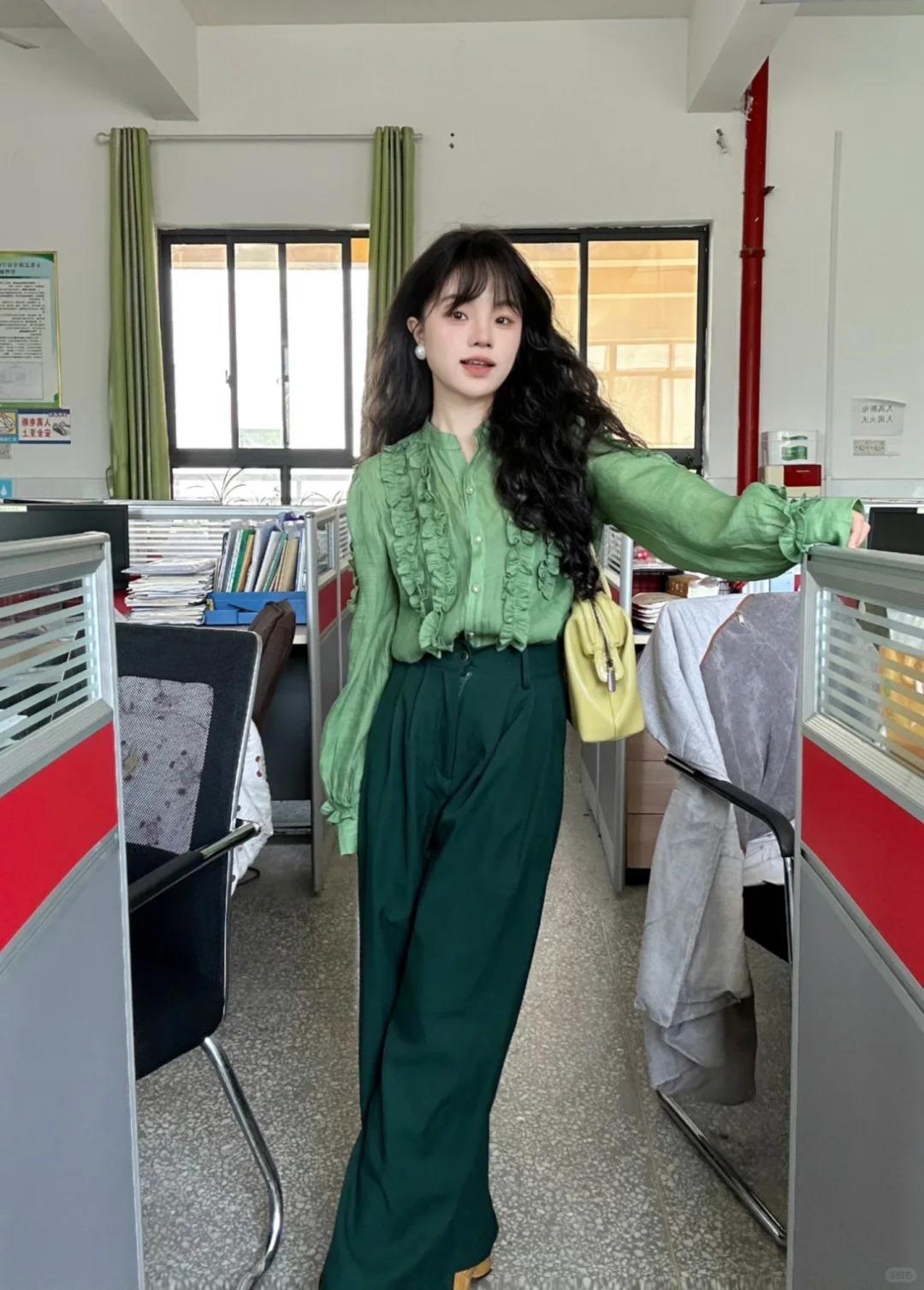 20:音樂老師的穿搭多少帶有點清新和藝術細胞,不同綠色調之間的組合搭配,清新淡雅還非常優雅。