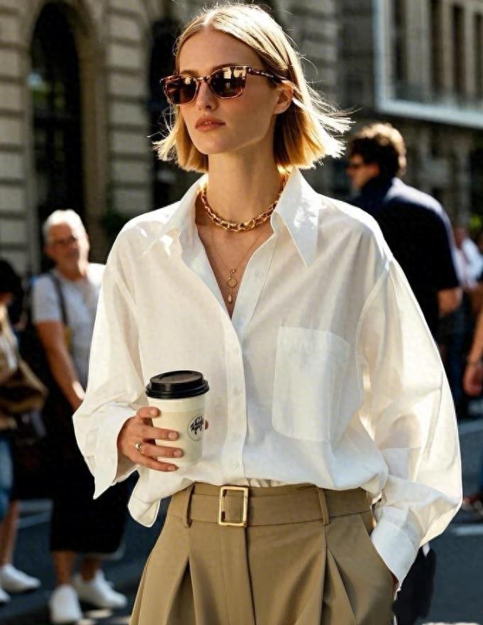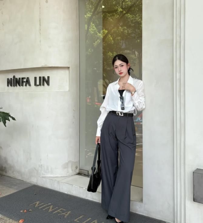 很適合職場通勤的一套穿搭,簡約卻不失高級感,白色襯衫,版型是相對寬鬆的,這樣的款式就不容易穿出過分正式與嚴謹,秋天的時候建議疊穿,微微露出內搭,增添幾分慵懶與隨性,再搭配一條深灰色高腰闊腿褲,高腰的設計,加上腰帶點綴,利落又拉長身材比例。
