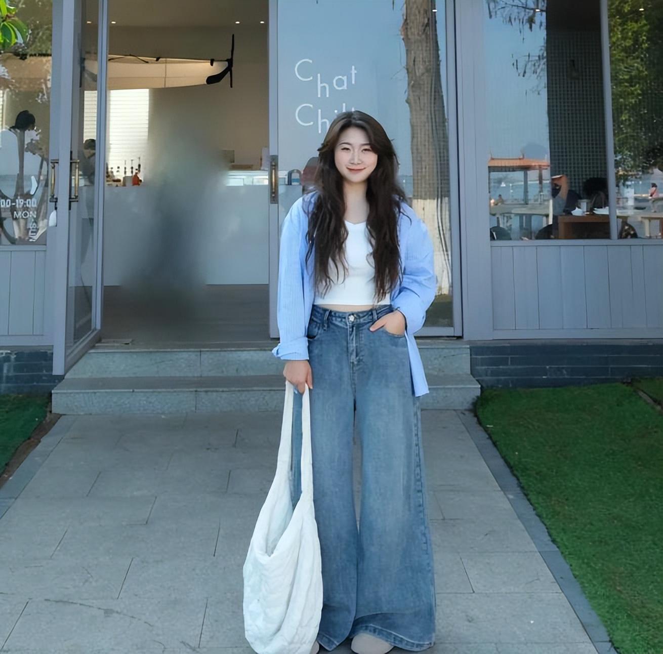 這一套清新隨性的休閒風穿搭,喜歡的就借鑑起來吧,十分適合出街、咖啡廳聚會等場合,淺藍色條紋襯衫內搭短款白色背心,稍微露出腰線,既顯得利落,又多了幾分清爽。寬鬆的版型,更是營造出隨性慵懶,下裝搭配深藍色牛仔闊腿褲,寬大的褲型很好修飾腿部線條,還自帶灑脫不羈,選擇一雙淺色鞋子來配,與整體的配色組合一起很和諧。