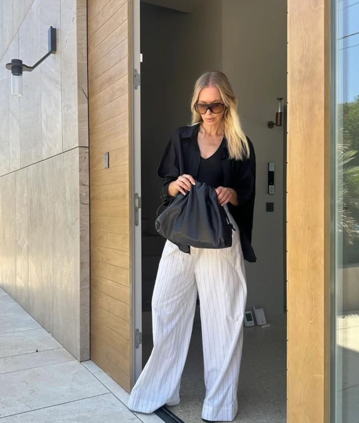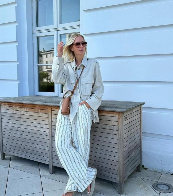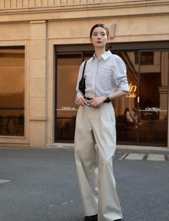 如果你覺得純色系的襯衫看起來太單調,那麼就試試這種條紋的吧,藍白相間條紋襯衫,經典的元素很耐看百搭,還帶着幾分清新氣息,記得要把袖口稍微挽起來,這樣顯得更隨性自在。下裝搭配淺米色闊腿褲,寬大的褲腿不僅修飾腿型,還展現出灑脫的格調,腳上穿上一雙黑色鞋子,與整體的風格很契合。