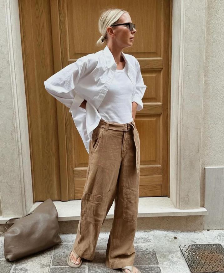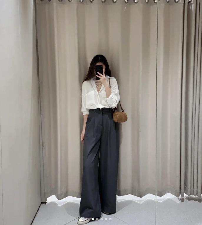 白色襯衫搭配深灰色高腰闊腿褲,整體的風格是簡約又帶點隨性,褲子的版型很寬鬆,既可以遮掩住腿部的缺點,還增添幾分灑脫感,腳上選擇一雙白色休閒鞋來配,爲整個着裝增添了休閒氣息,中和了襯衫帶來的成熟感,再挎着一個棕色包包,豐富了視覺層次,很適合出街或休閒的場合。
