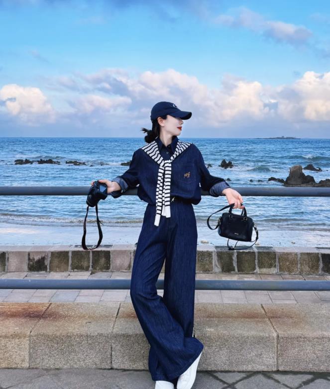 對於不懂搭配,或者是不想花費太多心思在搭配上的姐妹,就可以直接選擇套裝來穿,省心又不會出錯。這一套牛仔套裝,看着就很休閒又不失精緻,上衣是一件翻領牛仔襯衫,下裝是牛仔闊腿褲,寬鬆的版型給足了身材包容性,利用黑白條紋針織作爲披肩,爲整個造型增添了層次感,盡顯時尚。