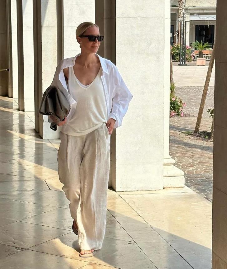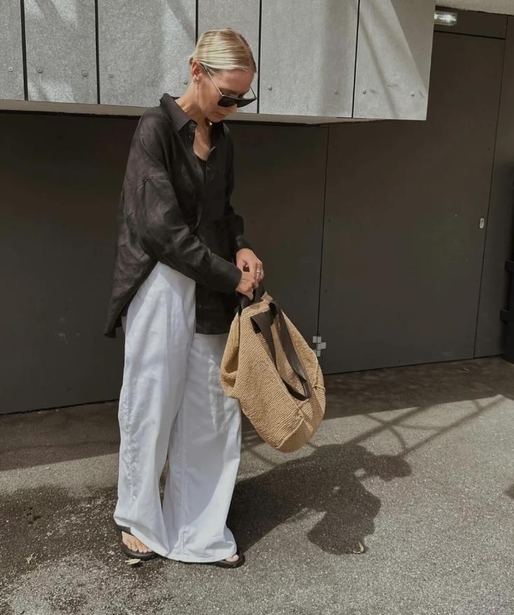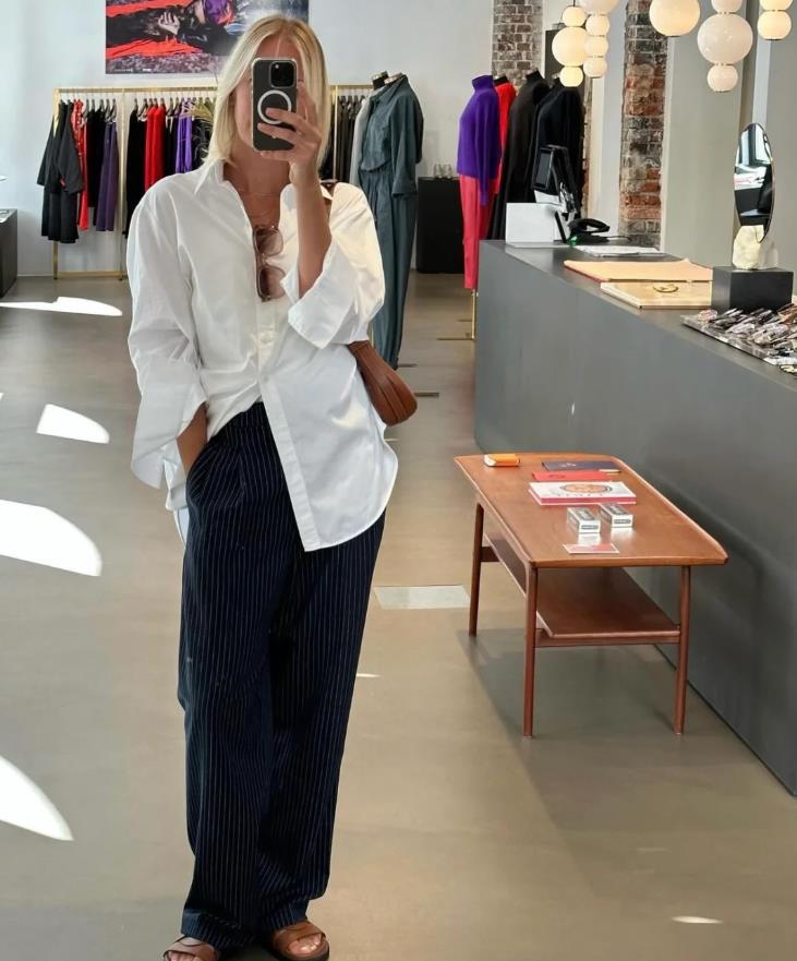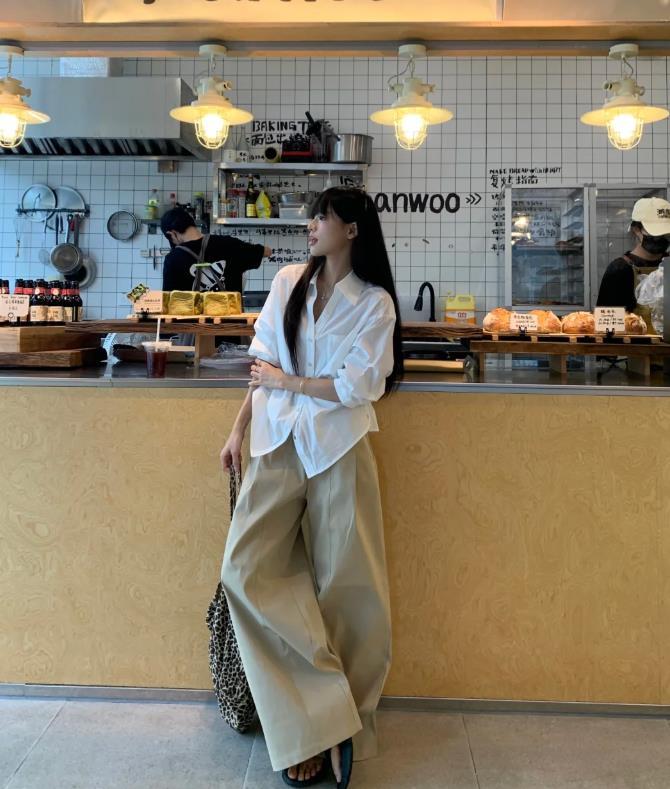 襯衫這種單品,本身是幹練與氣質的代表,但它一旦與寬鬆隨性的闊腿褲組合在一起後,就會顯得既氣質又隨性了。