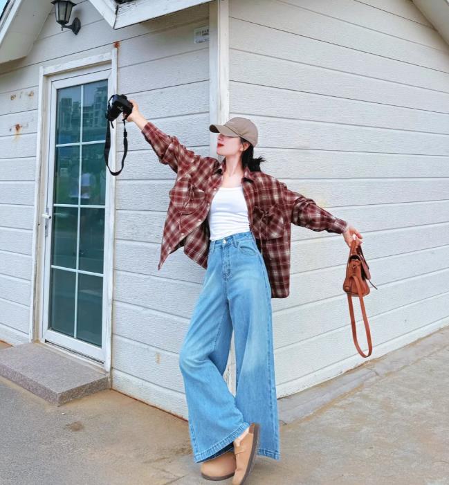 現在很多女性們都喜歡隨性自在的休閒穿搭了,這樣的穿搭無論是日常出街,還是度假都是很合適的。紅棕色格紋襯衫,寬鬆的版型,秋天直接拿來當外套穿,格紋元素復古氣息滿滿,也爲整個穿搭增加了文藝氣息,內搭白色背心,適當進行了提亮,搭配淺藍色牛仔闊腿褲,很是灑脫舒適的一套。