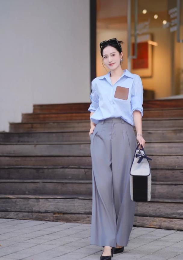 淺淺的藍色襯衫,很喜歡這個色調,清爽乾淨又給人很舒適的感覺,胸前棕色貼布的設計,增添了設計感,它的版型是寬鬆的,袖子稍微挽起來一些,就能營造出隨性範。搭配淺灰色西裝闊腿褲,垂墜感十足的面料,加上寬鬆的褲腿,很好修飾了腿型,還帶來幾分灑脫隨性的範。