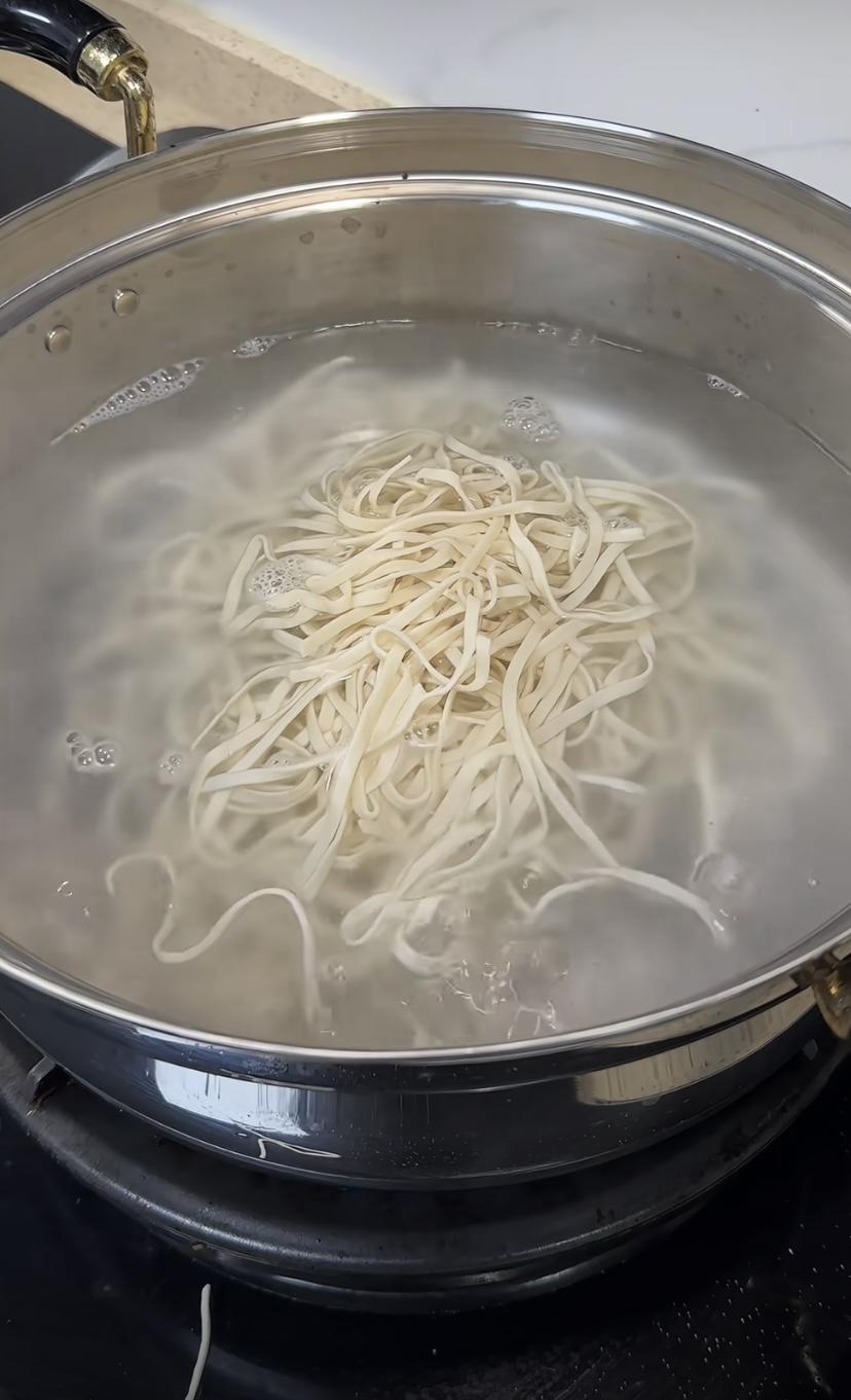清水鍋裏煮麪條,這個比較簡單。鍋里加清水,水開後直接煮麪。章齡之買的還是新鮮的麪條,鮮麪條會比較筋道一些,喫起來口感更好。