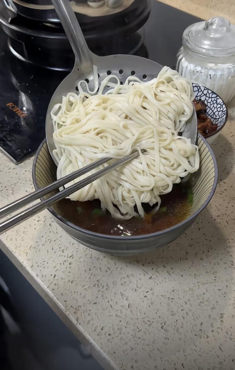 做完紅燒肉之後,章齡之就開始準備煮麪。煮麪之前,先調了湯汁。就是在碗裏放點蔥花、食用鹽、醬油、醋之類的基礎佐料就可以啦。