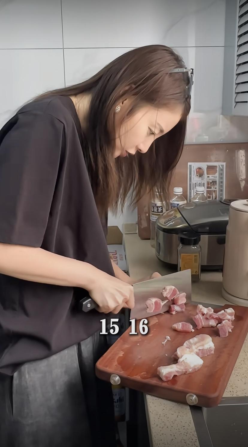 看見女兒切的肉塊這麼大,章媽媽表示紅燒肉喫多了是會生血脂的,這個塊太大了、需要重新改刀。