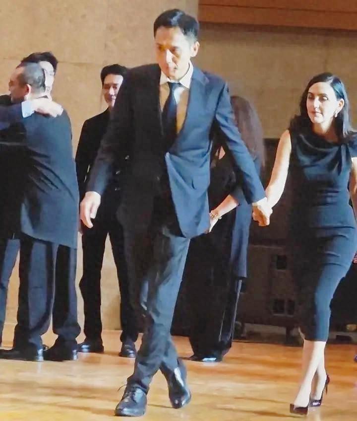 出席正式場合時,她偏愛白襯衫搭配黑色西裝褲。挺括的棉質白襯衫扎進高腰西裝褲,腰間悄悄系一根細黑帶,既拉長了身形比例,又添了幾分幹練。這套裝束曾出現在中法文化交流活動上,與她 “法中橋樑” 的身份不謀而合。