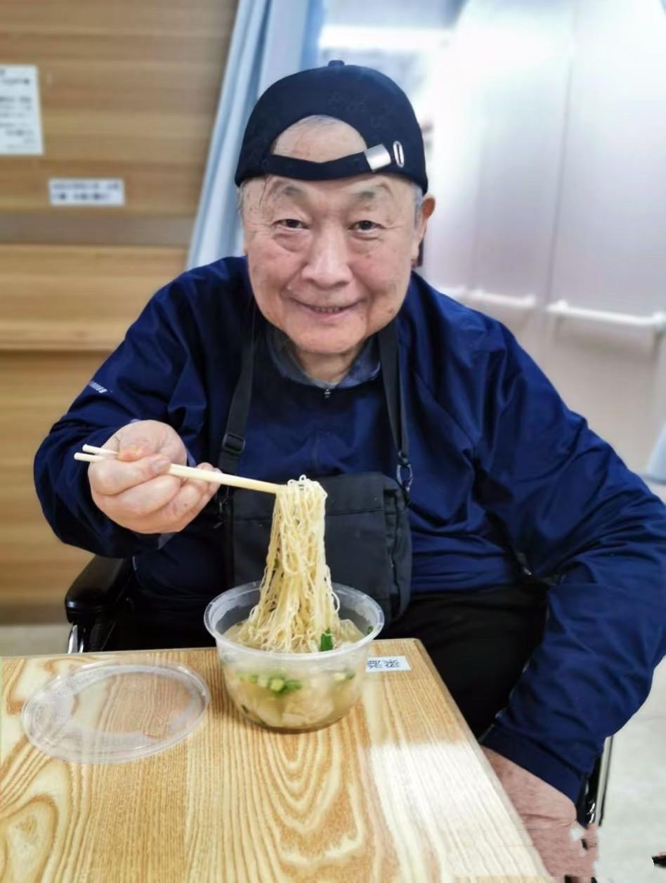 即便是過生日的時候,也沒有子女探望。還是媒體記者給他送了送日蛋糕、帶了一份長壽麪。看到有人探望,秦煌也是非常開心。