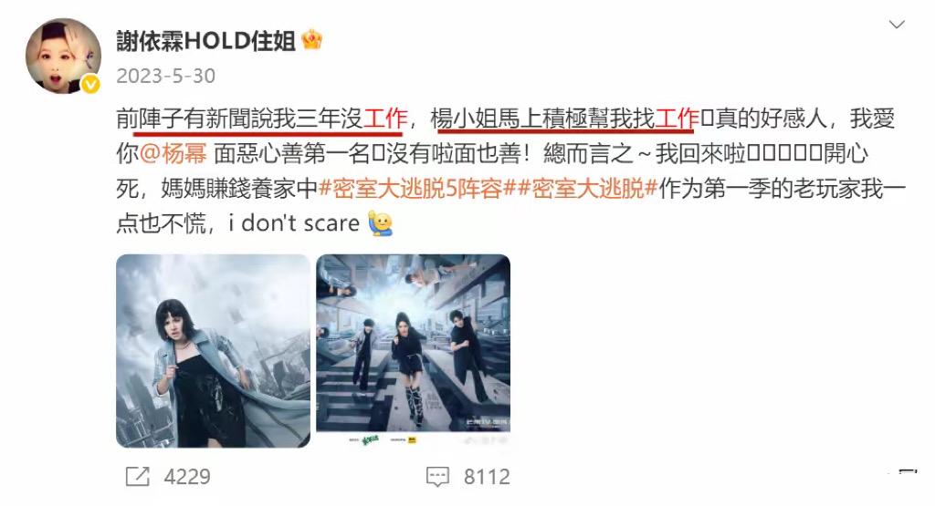 謝依霖是幸運的,雖然有新聞說她3年都沒有工作。可楊冪知道後,馬上給她安排了工作。於是謝依霖就開始成爲賺錢養家的媽媽,也參與了錄製《密室大逃脫》。