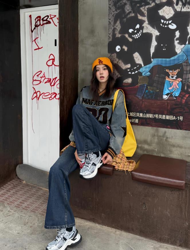 滿是街頭感的一套,上身是一件做舊的灰色衛衣,復古又個性,衣襬處稍微露出格紋一角,增添了層次感。下身搭配一條深藍色闊腿牛仔褲,寬鬆的褲型,修飾腿型又顯灑脫,腳上穿着一雙拼色運動鞋,時尚又舒適,頭上佩戴一頂橙色針織帽,輕鬆提亮了整個穿搭。