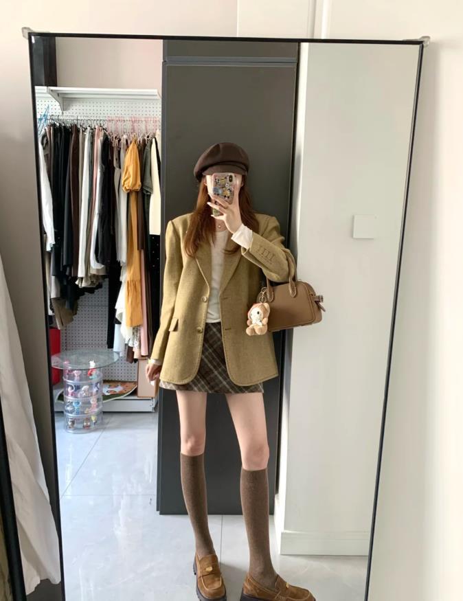 除了運動鞋之外,這個秋天也少不了一雙樂福鞋,這一套可是滿滿的復古英倫風,優雅還帶着俏皮,上身是一件卡其色西裝外套,內搭百搭的內搭,不失層次感,下裝搭配格紋短裙,將腿部的線條露出來,腳上穿的棕色長筒襪與同色的樂福鞋,整體的配色很和諧統一,不管是日常逛街,還是上班通勤都合適。