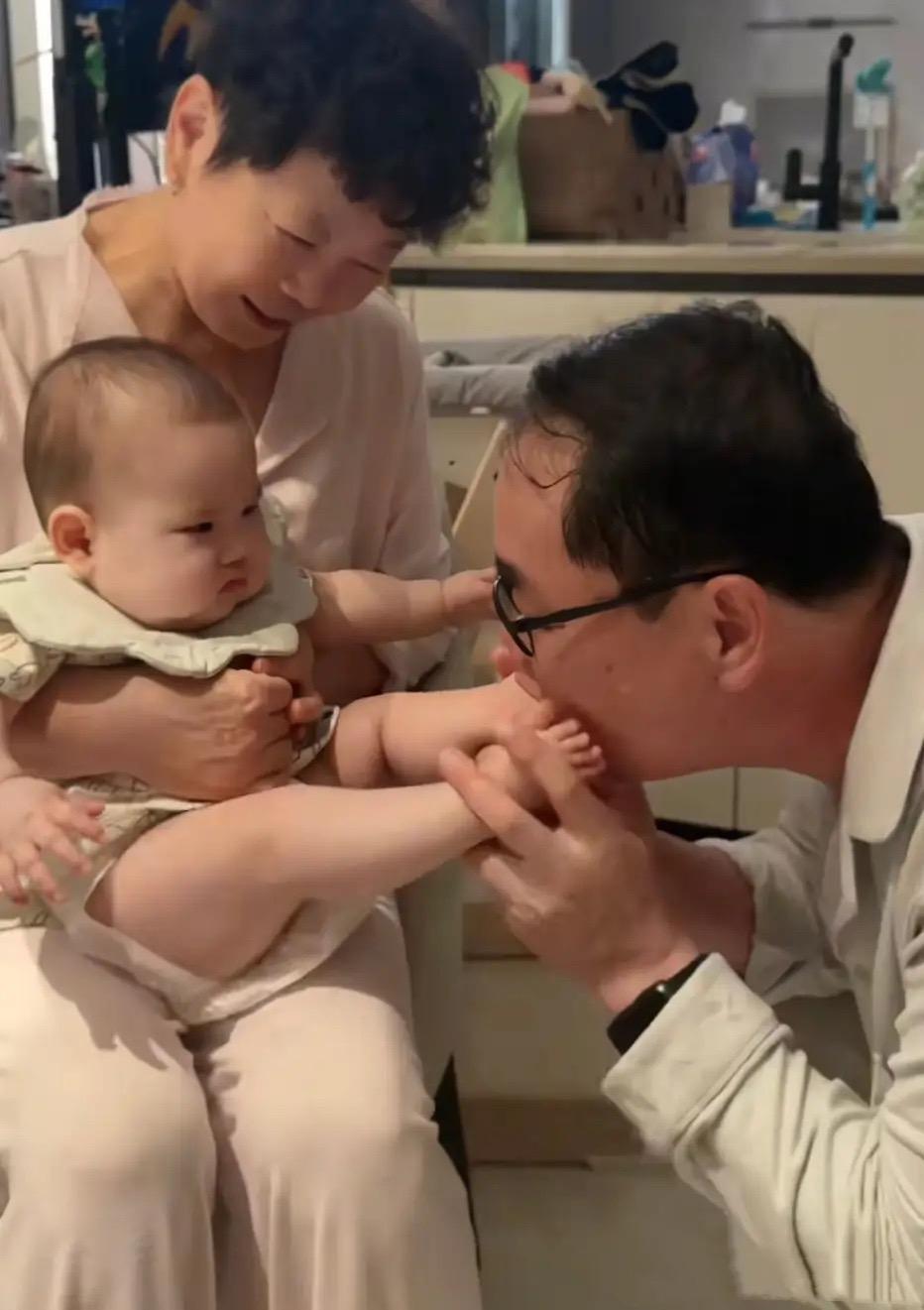 外公還親親外孫的小腳丫,這小傢伙皮膚白白的、肉嘟嘟的可真可愛呀,感覺連小腳丫都是香香的呢。