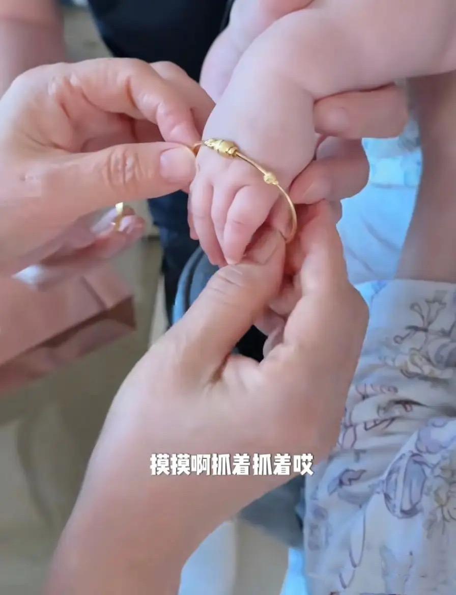 外公親自把金鐲子給Dylan戴上,金鐲子看着特別細,但應該是實心的吧。畢竟孩子太小了,如果手鐲太粗的話,可能會壓手腕。