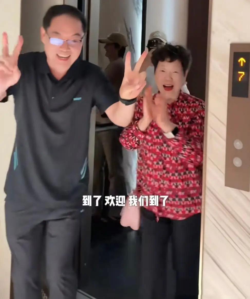到家後,老兩口都特別開心的打招呼,甚至張檬爸爸還對着鏡頭比耶,也非常開心張檬能記錄他們看娃的經歷。