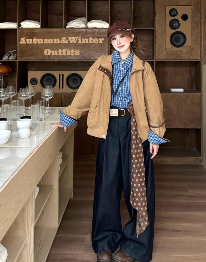 秋天到了,就該爲自己選擇一些卡其色的單品,這一件短款卡其色鹿皮外套,瞧着就很百搭氣質,內搭藍白格紋襯衫,增加了層次感,又帶着滿滿的復古氣息,下面選擇一條深藍色闊腿褲,腰間利用一條棕色波點絲巾進行點綴,與棕色皮帶、鞋子,還有貝雷帽進行了呼應,盡顯灑脫與隨性。