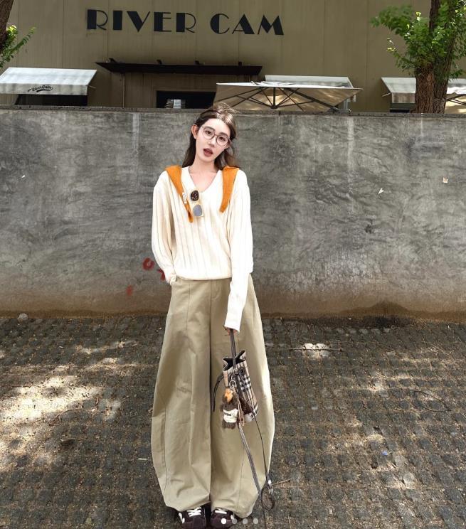 喜歡簡單些穿搭的,就好好借鑑下這套,簡約又不失清新感,米白色的v領針織衫,這個色調沒有白色那般難駕馭,卻一樣的百搭,搭配卡其色闊腿褲,寬鬆的褲型,可以讓你穿得很隨性自在,格紋小包與深色的鞋子,讓整個配色很和諧,適當增加的配飾,很好爲造型增添了精緻感。