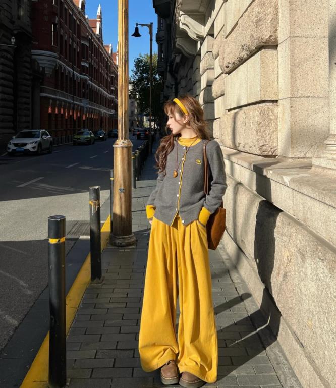 充滿活力氣息的一套穿搭,整體的風格是偏向休閒風的,淺灰開衫內搭黃色高領打底,色彩的碰撞很大膽又富有層次感,內搭與下裝的黃色闊腿褲進行了呼應,很舒適自在,選擇棕色的包包,厚底鞋,以及黃色的頭飾,整個色調很統一,日常出街或者是上班都可以。